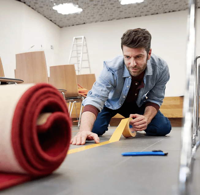 Double-sided tape can help keep mats, rugs, and lightweight floor coverings in place, reducing movement and improving safety in low-traffic areas.
